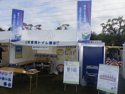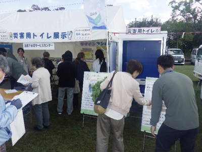 ブース内に啓発パネルやデザインマンホールの展示、また災害用トイレの設置なども行い、